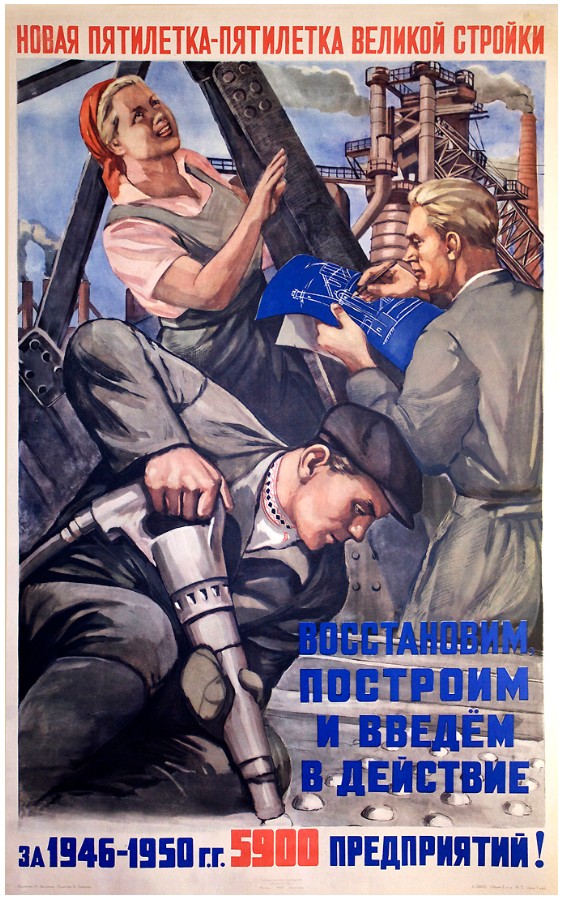 After the war, she continued to produce posters supporting the Soviet state and the five-year plans, promoting industrial development, and education.